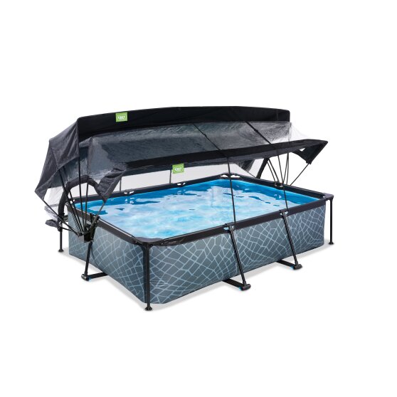 Der EXIT Stone Pool 220 x 150 x 65 cm ist ein rechteckiger, grauer Rahmenpool mit Abdeckung und Sonnensegel, dass dich an Sommertagen vor der Sonne schützt. Der kompakte Pool ist standartmäßig mit einer Filterpumpe ausgestattet und fällt durch sein tolles Steinmuster zwischen anderen Pools auf. Bist Du auf der Suche nach einem geeigneten Pool für Kleinkinder , der nicht zu viel Platz im Garten einnimmt? Dann entscheide dich für diesen einzigartigen und hochwertigen Rahmenpool mit Abdeckung von EXIT Toys!