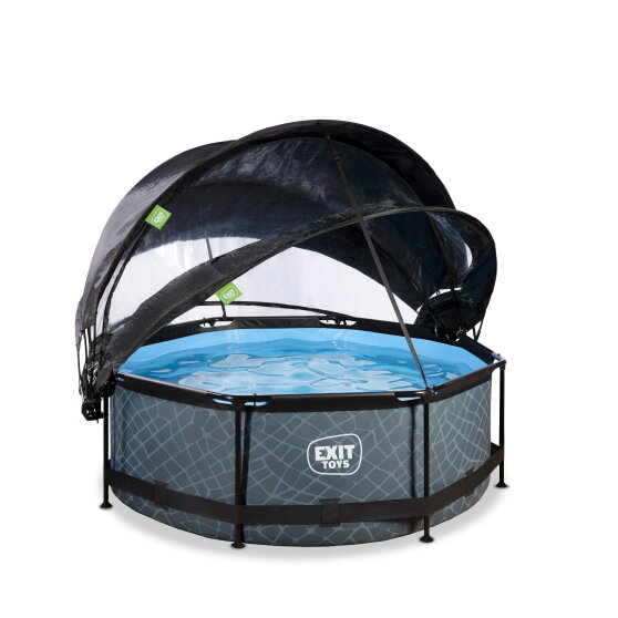 Der EXIT Stone Pool ø244x76cm ist ein runder grauer Rahmenpool mit Abdeckung und Sonnensegel. Der kompakte Pool ist standartmäßig mit einer Filterpumpe ausgestattet und fällt durch sein tolles Steinmuster zwischen anderen Pools auf. Bist du auf der Suche nach einem schönen und gleichzeitig einmaligen und hochwertigen Rahmenpool für deinen Garten? Stiehl die Show mit einem runden Pool von EXIT Toys!
